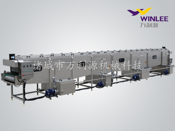 本巴氏杀菌及喷淋冷却机应用于果汁(茶)等饮料灌装生产线而设计制造。又名隧道式巴氏杀菌及喷淋冷却组合机组。是一种处理如易拉罐、PET瓶饮料灌装好了的二次杀菌设备。通过输送带的传送,进入隧道式喷淋杀菌、喷淋冷却、常温出瓶。在巴氏杀菌及喷淋冷却机中的各个温度区域内,容器受到不同温度水的喷淋,也就是杀菌阶段和冷却阶段。其采用了喷淋到较凉的容器上的水将会变热,这部分较热的水被用来冷却已经被杀菌处理过了的较热的容器,以便容器进行逐步冷却,这样既可以避免过热而造成的口味损失,又能够防止容器热应力的突变而产生碎瓶或瓶变形。并且加热区域和冷却区域相互连接起来之后,能量能很好地再生利用——这就是称之为能量再生原理。隧道式巴氏杀菌机充分利用了这一热量平衡原理,能耗非常低,只有杀菌区域使用了有限的能源。