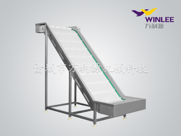 2、采用SUS304不锈钢链板输送,链板上带有刮板,方便大角度提升物料。